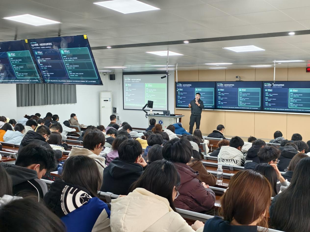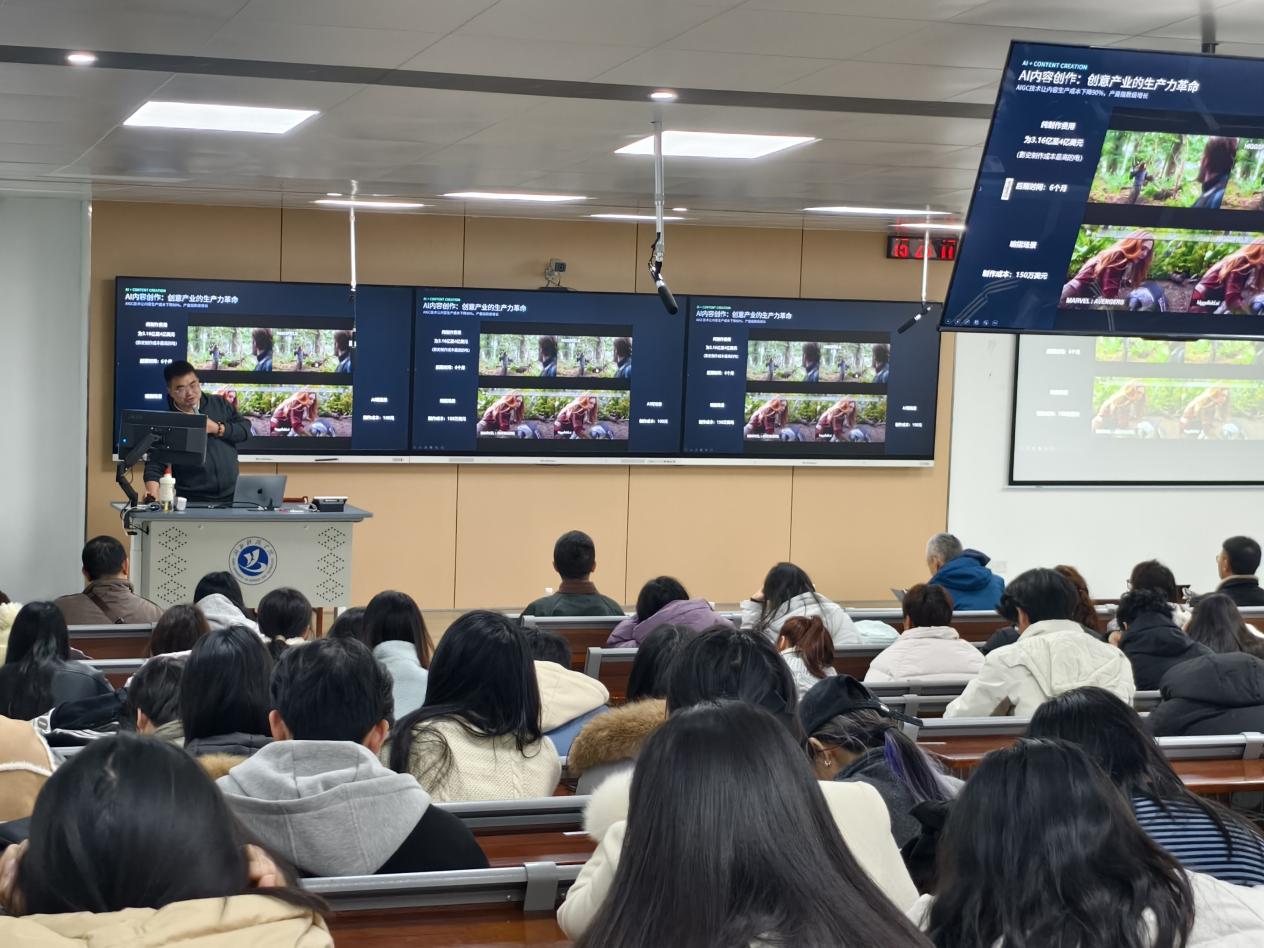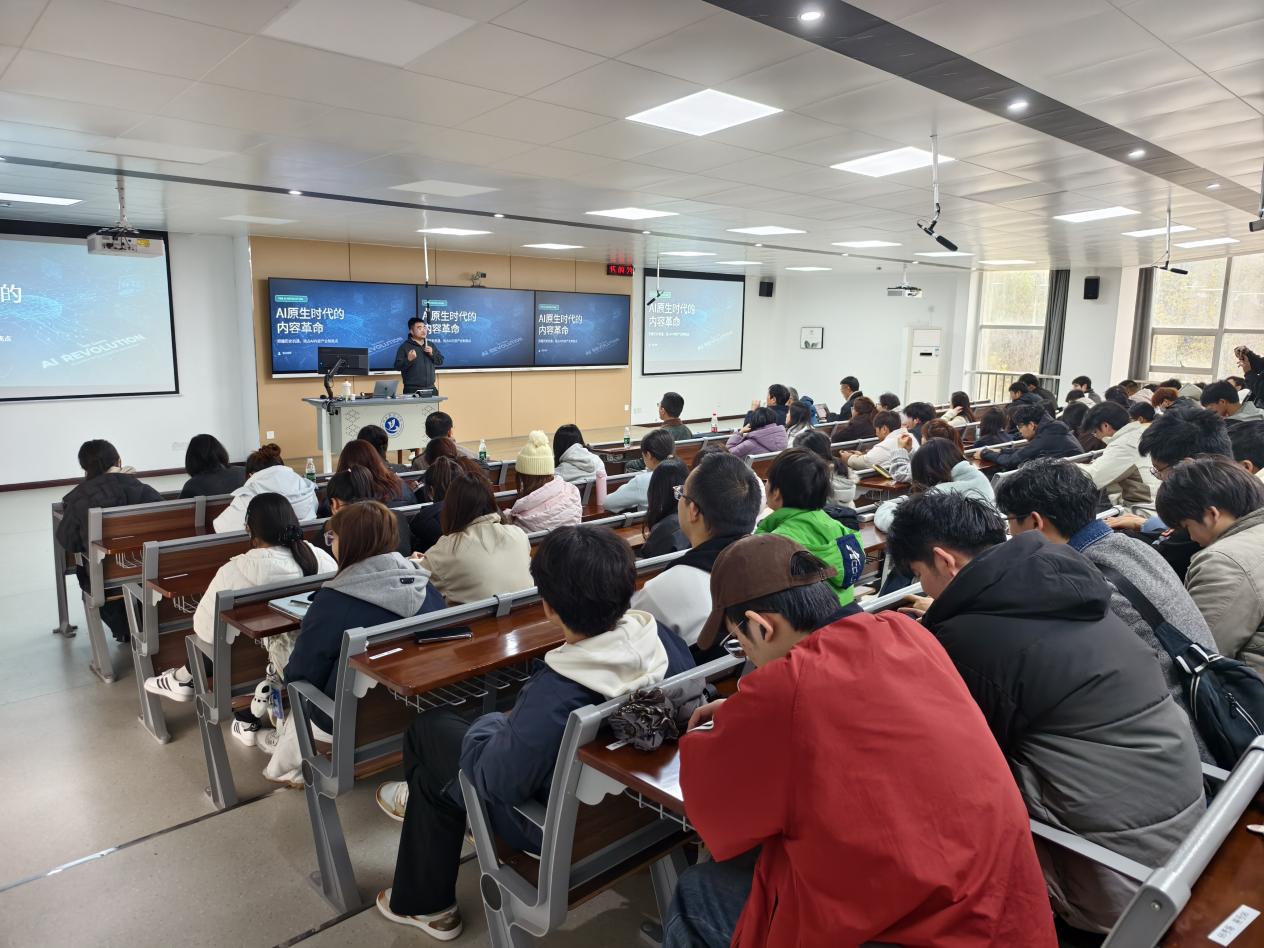 针对同学们普遍关心的行业发展趋势与就业前景,胡总结合当前市场需求与人才标准,详细解读了AI内容创作领域的职业方向、能力要求与发展空间,为大家规划学习路径、提升专业竞争力提供了务实参考。同学们全程聚精会神聆听、认真记录笔记,对讲座内容表现出高度关注与浓厚兴趣。讲座结束后,同学们纷纷表示深受启发,对AI内容创作的未来充满期待。