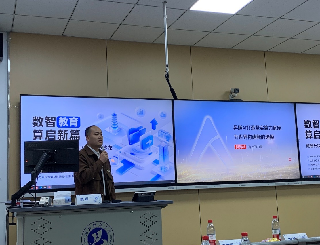 主题分享环节,武汉昇腾生态创新中心吴峰介绍了昇腾AI全栈解决方案及万卡集群建设成果;湖北科技学院陈博副教授分享了AI辅助软件工程教学改革的实践经验;中建材信息姚俊峰讲解了鲲鹏高性能计算解决方案;北京文华在线王代阳演示了AIEC人工智能中心建设方案。