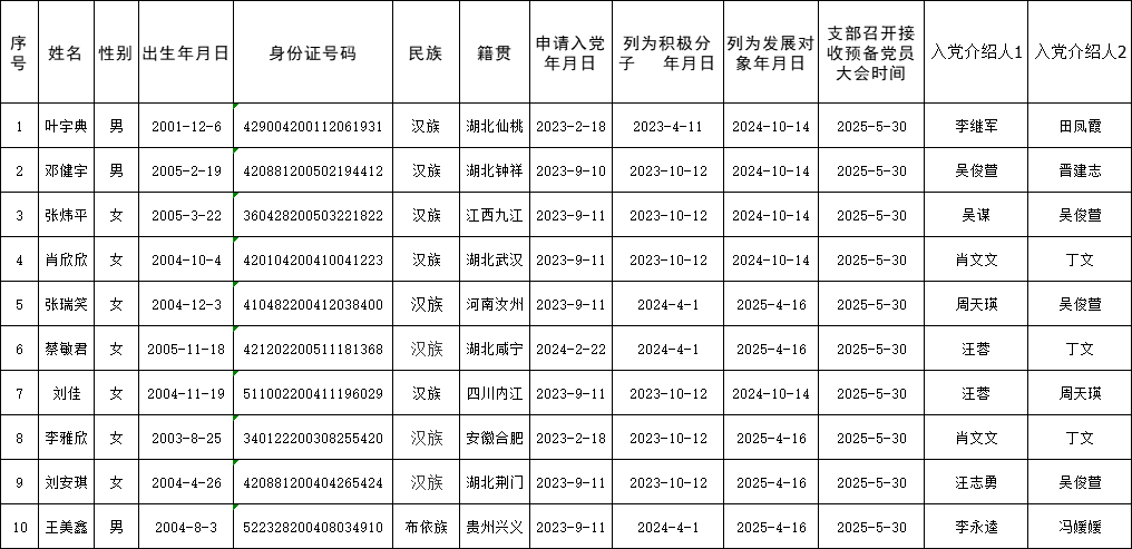 根据个人现实表现、班主任意见及量化考核分数,经计算机科学与技术学院学生第一党支部支部大会讨论研究,拟确定接收叶宇典等10名同志为计算机科学与技术学院学生第一党支部2025年上半年预备党员。现予以公示: