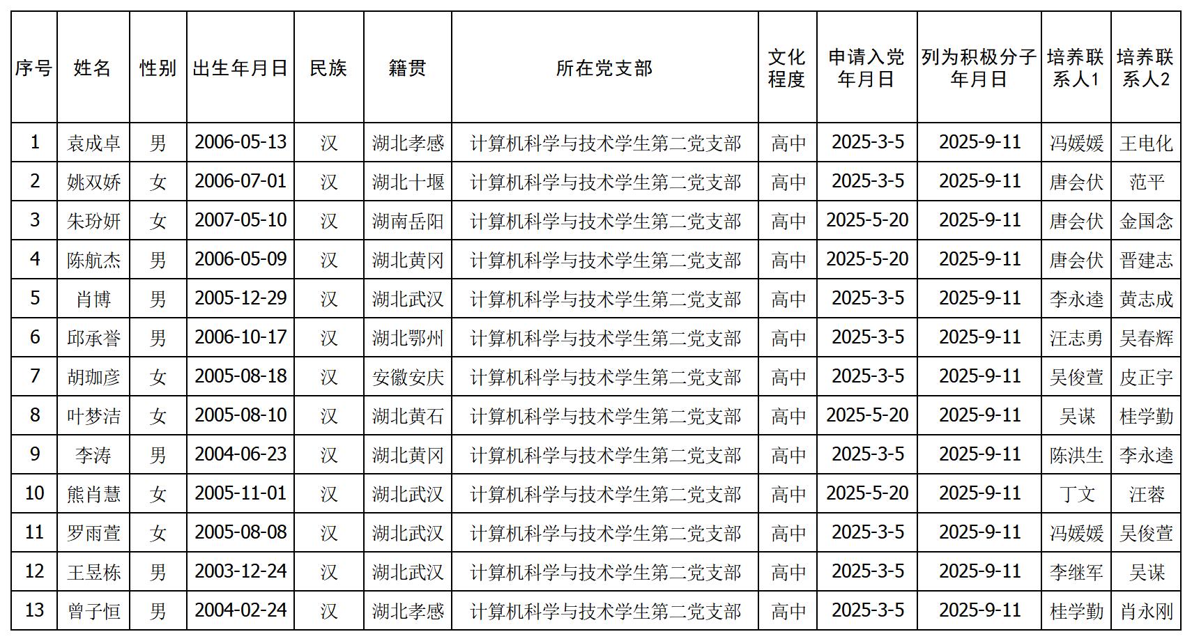 经个人申请、群团组织推优及党内外群众意见征询,结合现实表现及量化考核分数,经计算机科学与技术学生第二党支部委员会讨论研究,拟确定袁成卓等13名同志为计算机科学与技术学生第二党支部2025年上半年入党积极分子。现予以公示:
