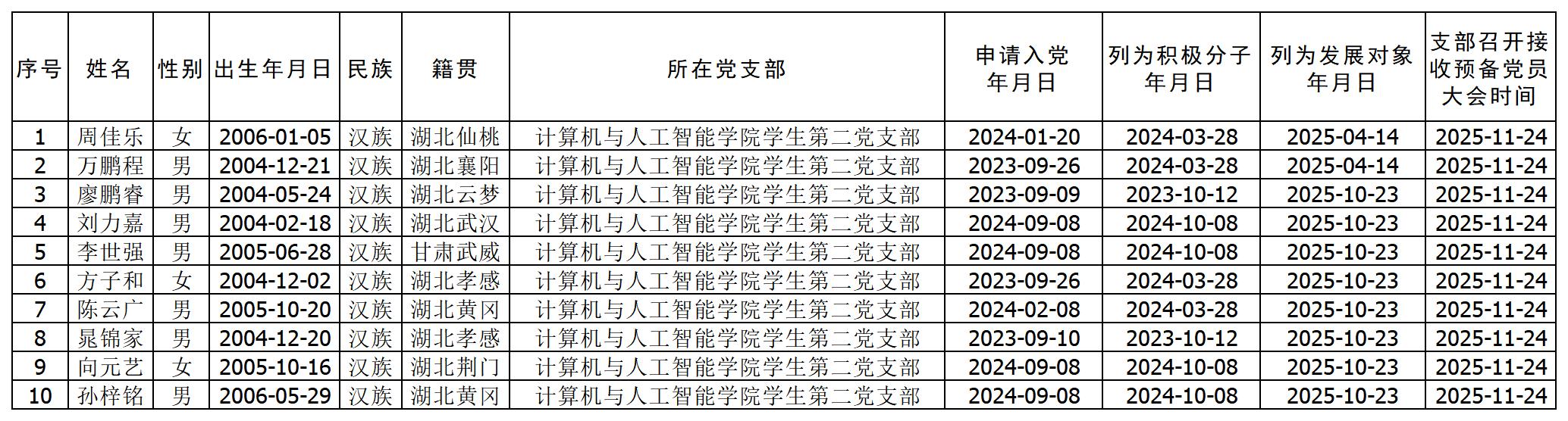 根据个人现实表现、党内外群众意见及发展对象量化考核分数,经计算机与人工智能学院学生第二党支部支部大会讨论研究,拟确定接收周佳乐等10名同志为预备党员。现予以公示: